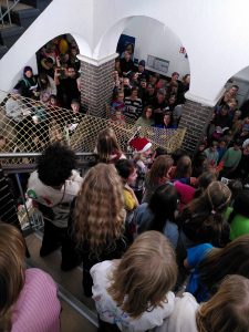Den Höhepunkt zum Abschluss stellte der Auftritt der Kiefholz-Chorwürmer im pickepackevollen Treppenhaus dar. Herr Schmitz nutzte mit seinen eifrigen Nachwuchs-Sängerinnen und -Sängern die gute Akustik der Gewölbedecke um die anwesenden Eltern endgültig tief in vorweihnachtliche Stimmung zu versetzen und sogar zum Mitsingen zu animieren.
